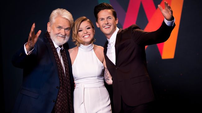 Hasse Andersson, Clara Henry och David Lindgren kommer leda Melodifestivalen 2017. Foto: Magnus Liam Karlsson/SVT