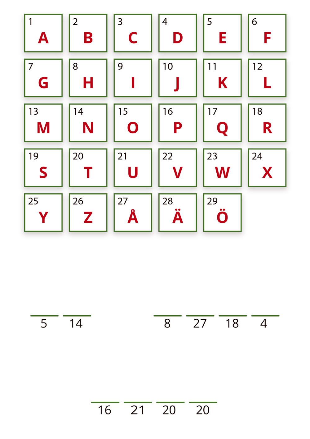 Lyssna Läshastighet: Långsam Vanlig Hög Ester har skrivit ett hemligt meddelande till dig. Skriv rätt bokstav ovanför numret. Läs mer om Julkalendern här! Meddelandet Skriv meddelandet i rutan. OBS! Tänk på att inte skriva punkt (.) i slutet. Δ