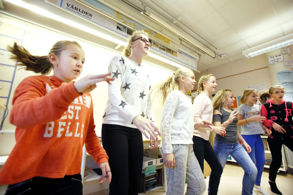 – VI körde den på handbollsträningen och så tog vi med den till fotbollen och nu till skolan. Det var lite stelt i början och några killar var inte med alls, men nu hoppar, dansar och klappar alla, säger Hilla Svärd.