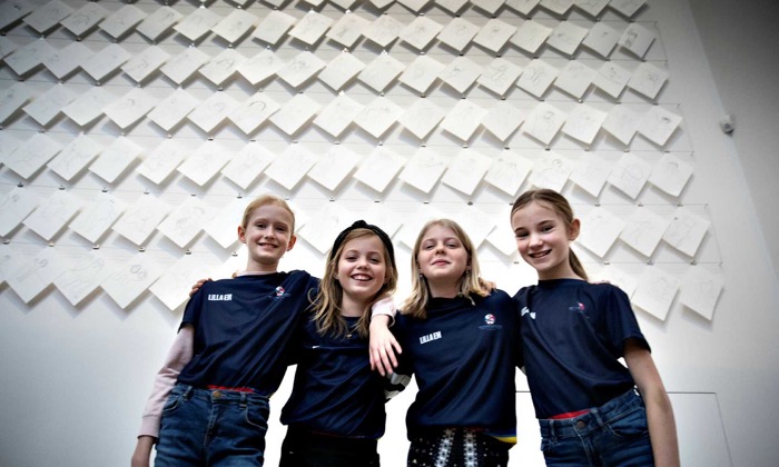 Från vänster: Stella Svensson, Ellen Magnusson, Emma Jakobsson och Nicole Norén från Risebergaskolan. 250 barn från Skåne har skapat konst som nu ska visas upp på Malmö Arena och Moderna Museet i Malmö. Bild: Lars Brundin