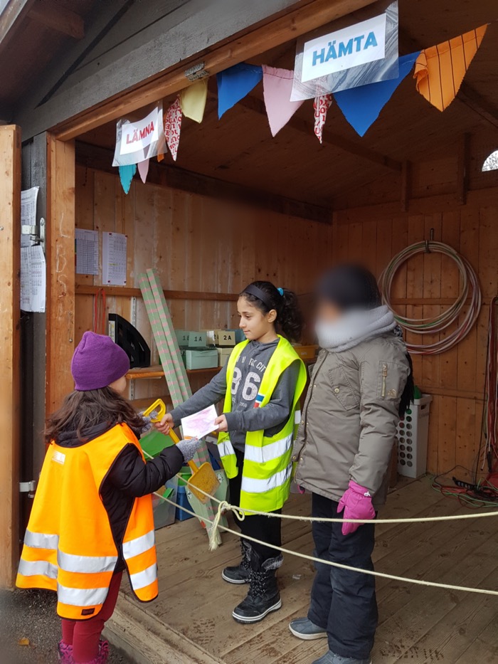 Det här är Årbyskolans lekkiosk. Den är öppen på tiorasten. Om man har lånekort kan man få låna leksaker. Två elever jobbar i lekkiosken.