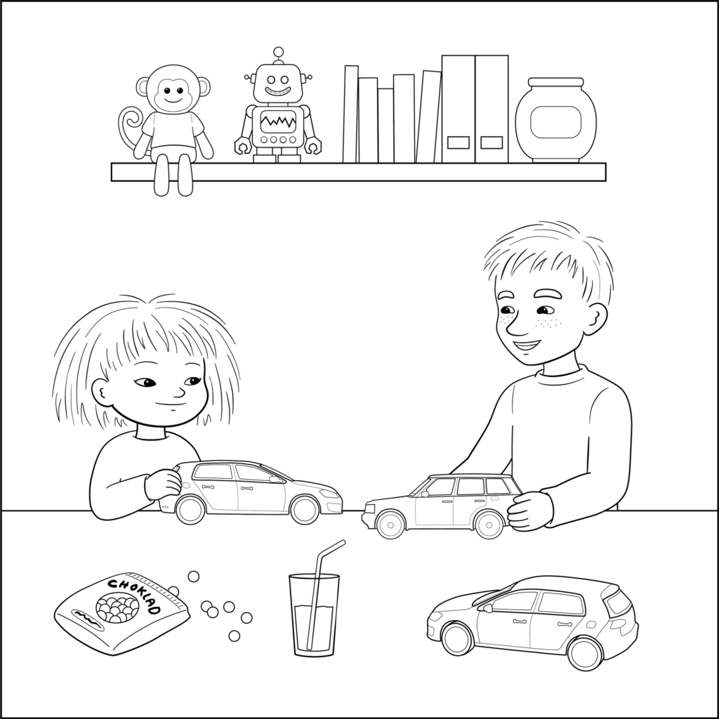 Skriv ut bilden med Minja och Mino och färglägg den.