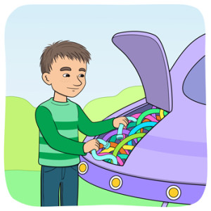 Det är en alien. Minja och Mino blir lite rädda men de vågar gå fram.
