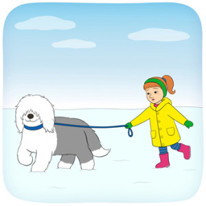 Minja går i parken med sin lurviga hund.