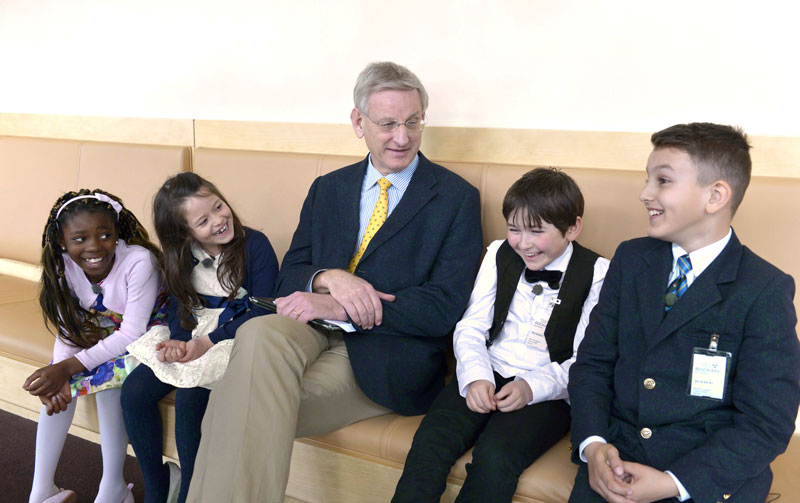 Carl Bildt är Sveriges före detta utrikesminister. Här är han barnvakt till barnen Oriana, Filippa, Felix och Adam i Kändisbarnvakten. Foto: Carl-Johan Söder/SVT