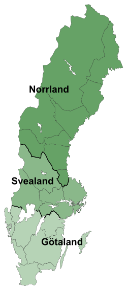 Sverige är uppdelat i tre delar. Götaland ligger längst söderut. Den mellersta delen heter Svealand. Längst norrut ligger Norrland.